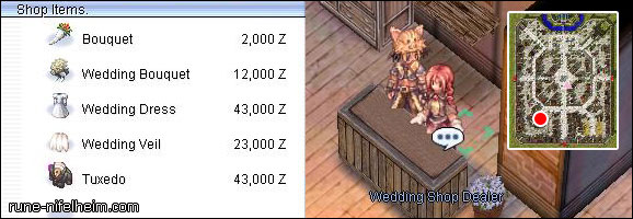 Antes de casarte tendras que conseguir el atuendo adecuado para la ocasion, el novio tendra que llevar un Tuxedo y la novia un Wedding Dress, estos items se pueden obtener en una tienda de Prontera.