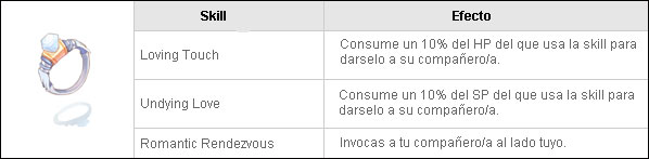 La ventaja principal de casar dos personajes son las skills que se consiguen al hacerlo. Para usarlas, es necesario equiparse el Wedding Ring. El wedding ring siempre permanecerá en el inventorio del personaje y no se puede vender ni tradear.